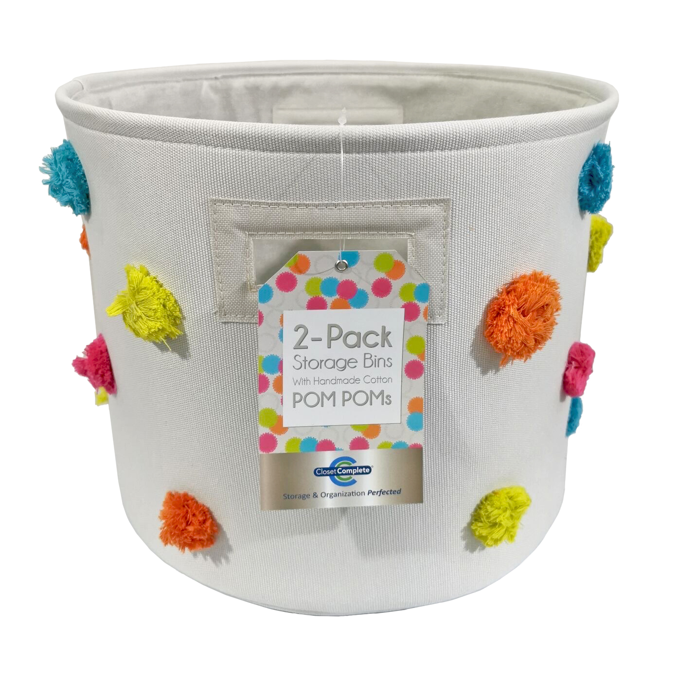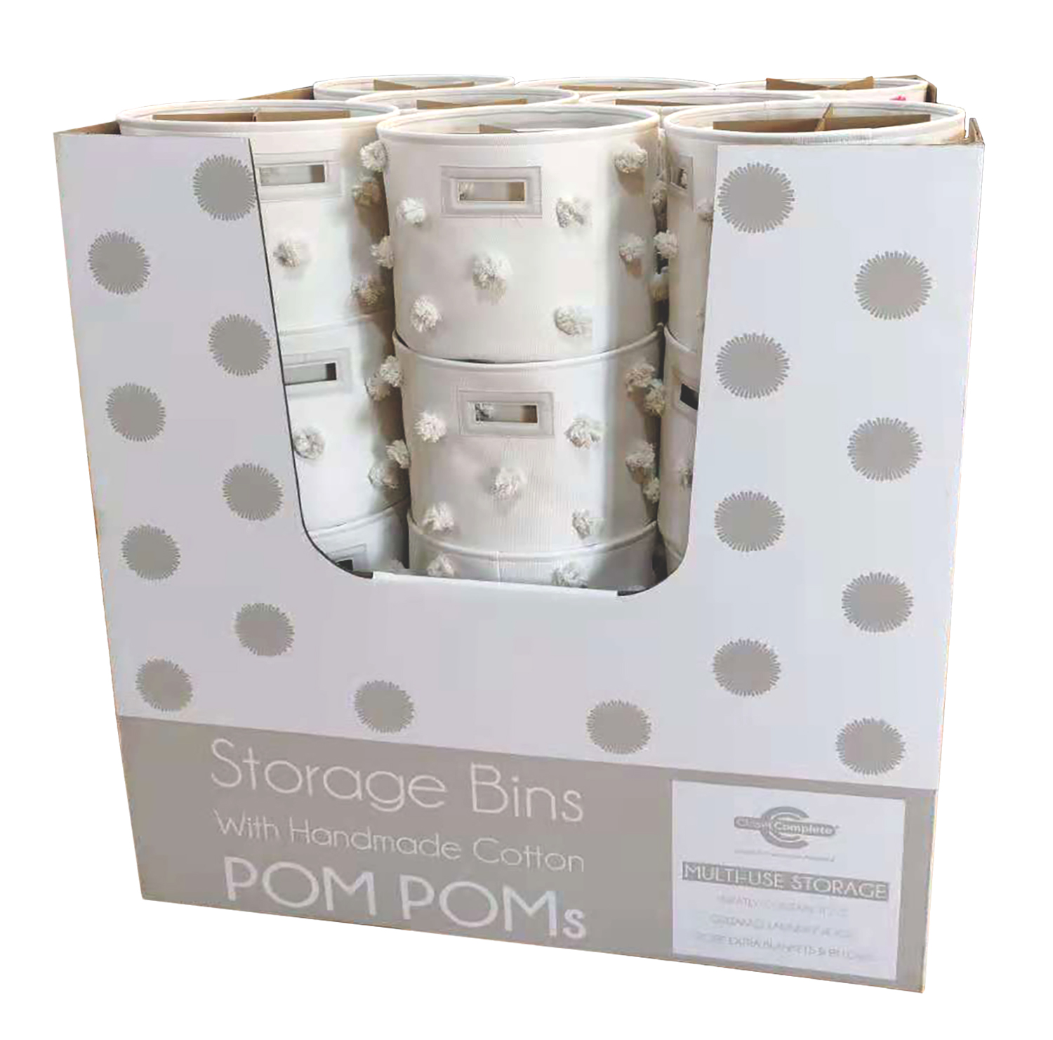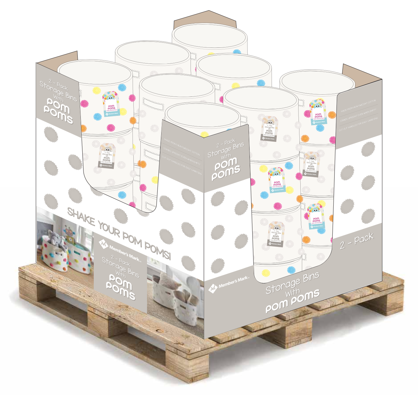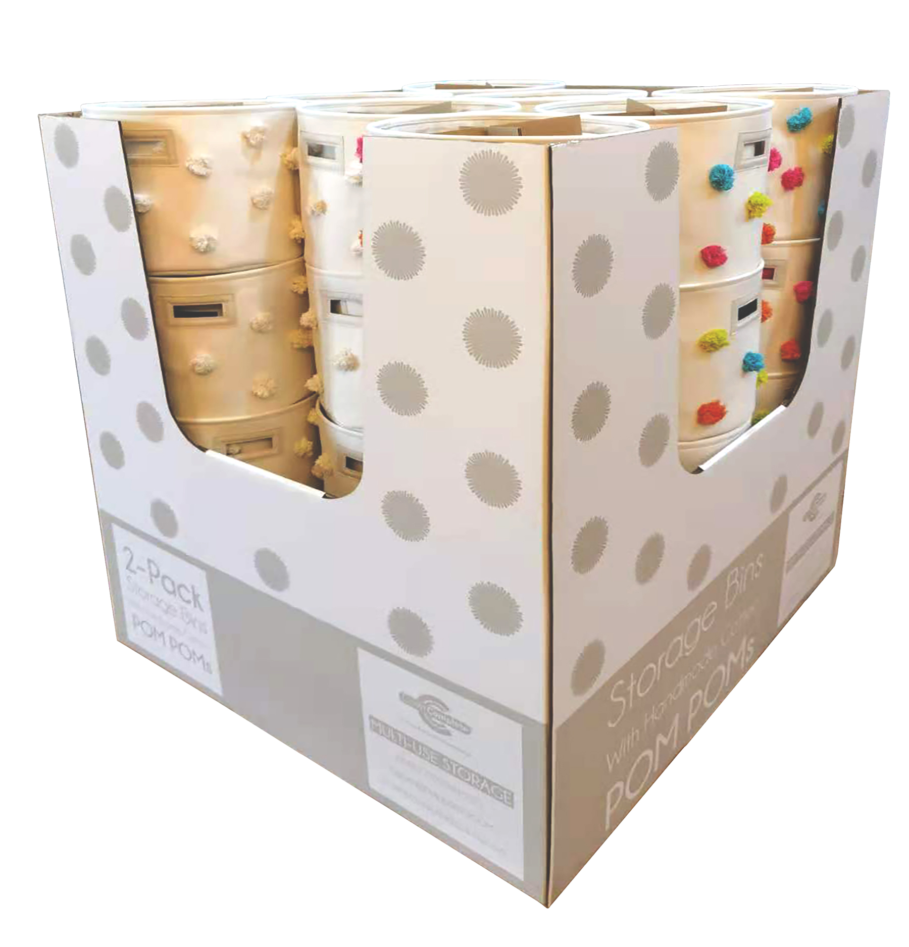 2 pack of decorative bins with pom pom. Hangtag and large dump bin design for pallet display.