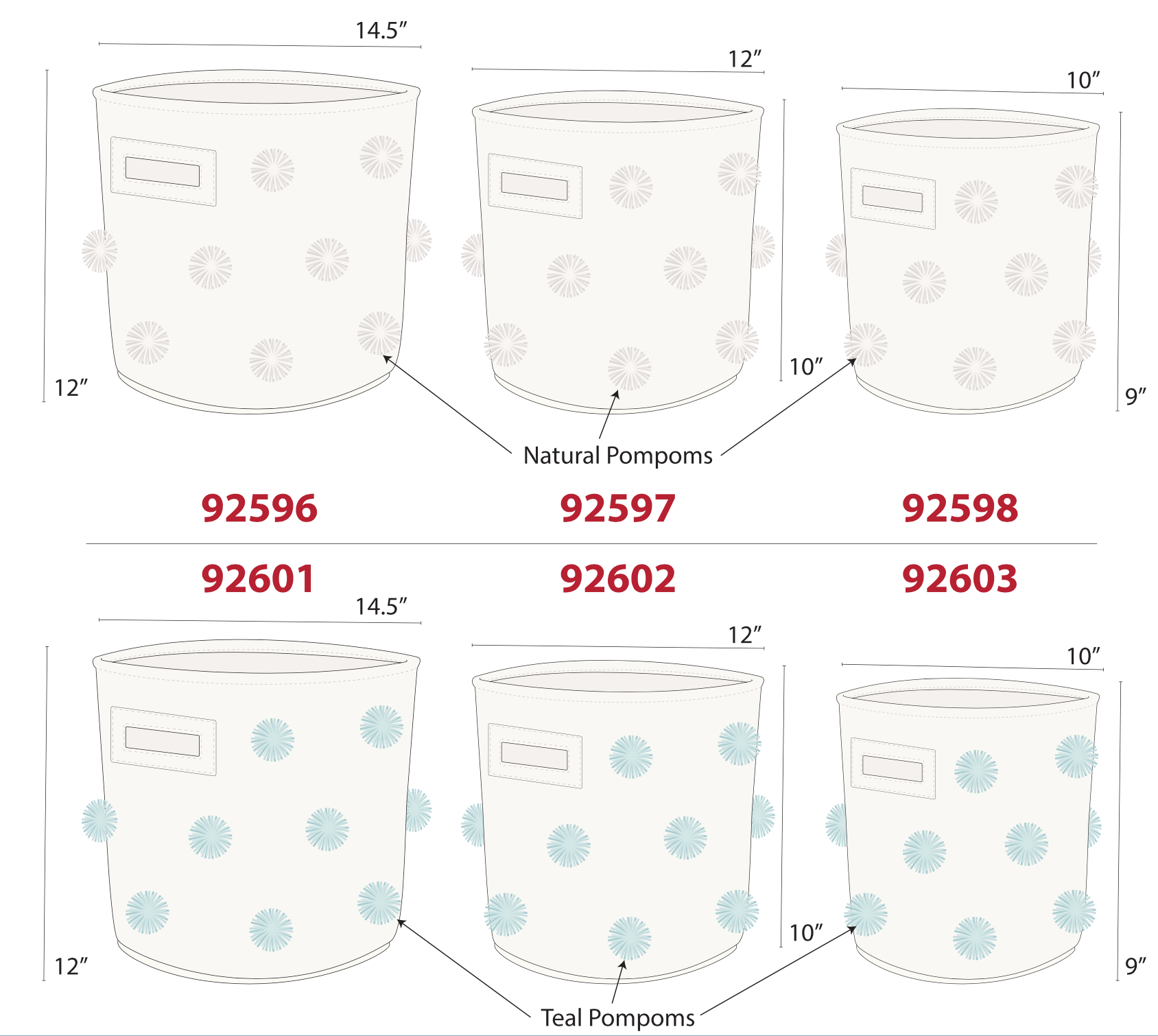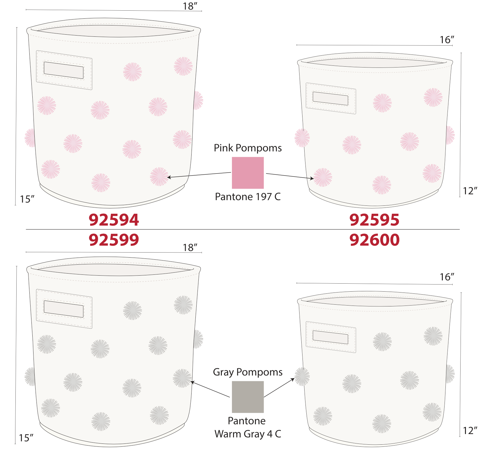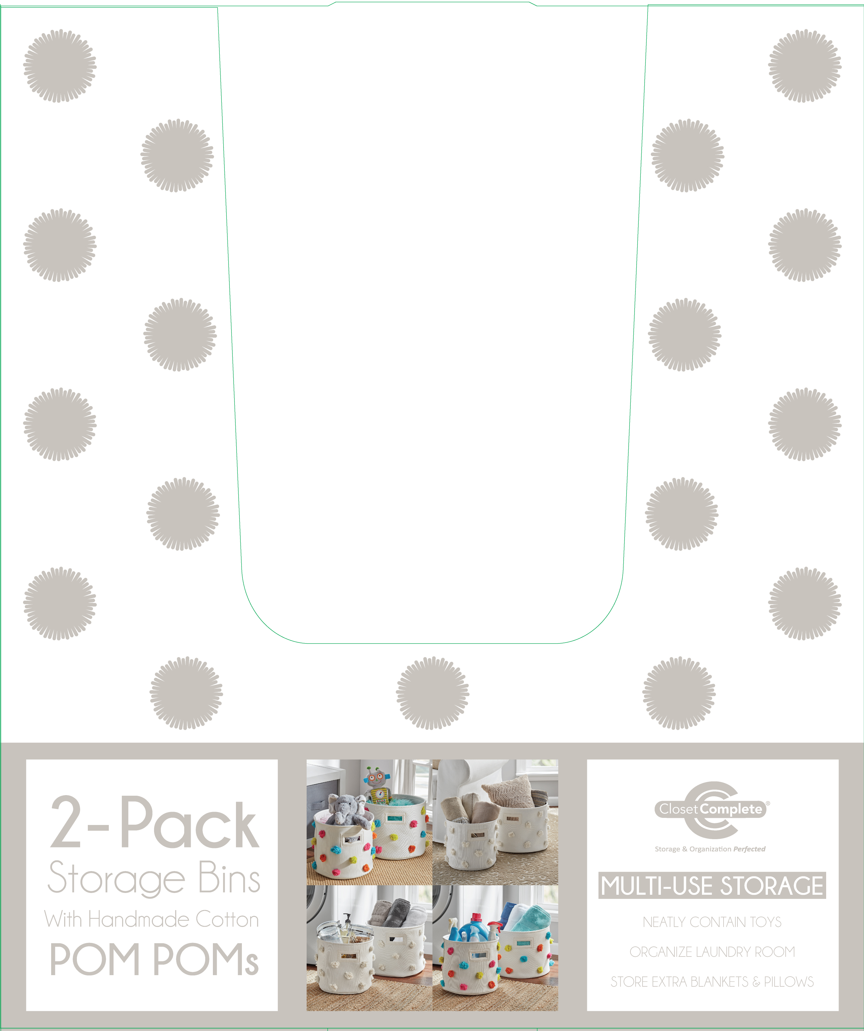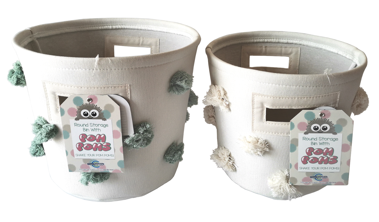 2 pack of decorative bins with pom pom. Hangtag and large dump bin design for pallet display.