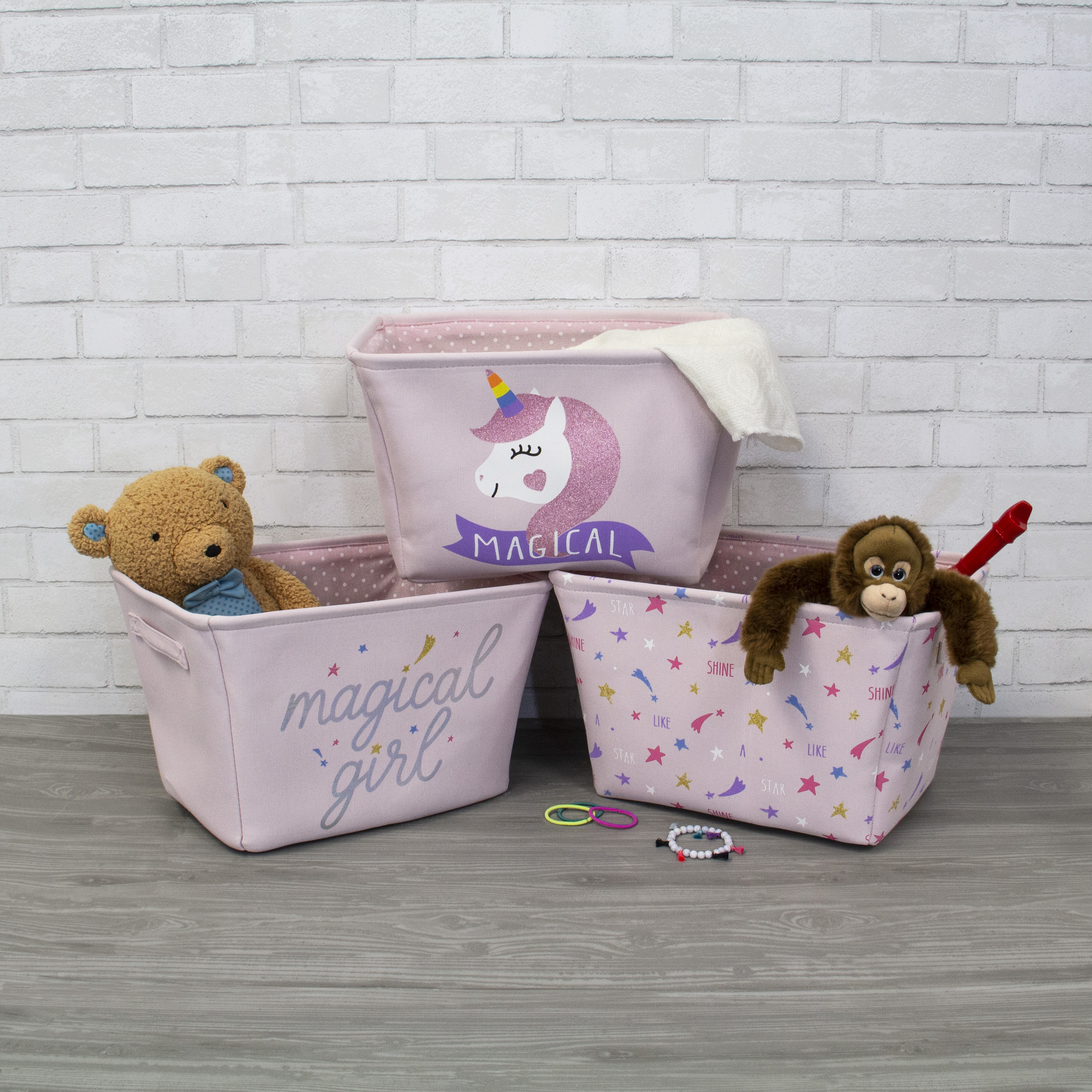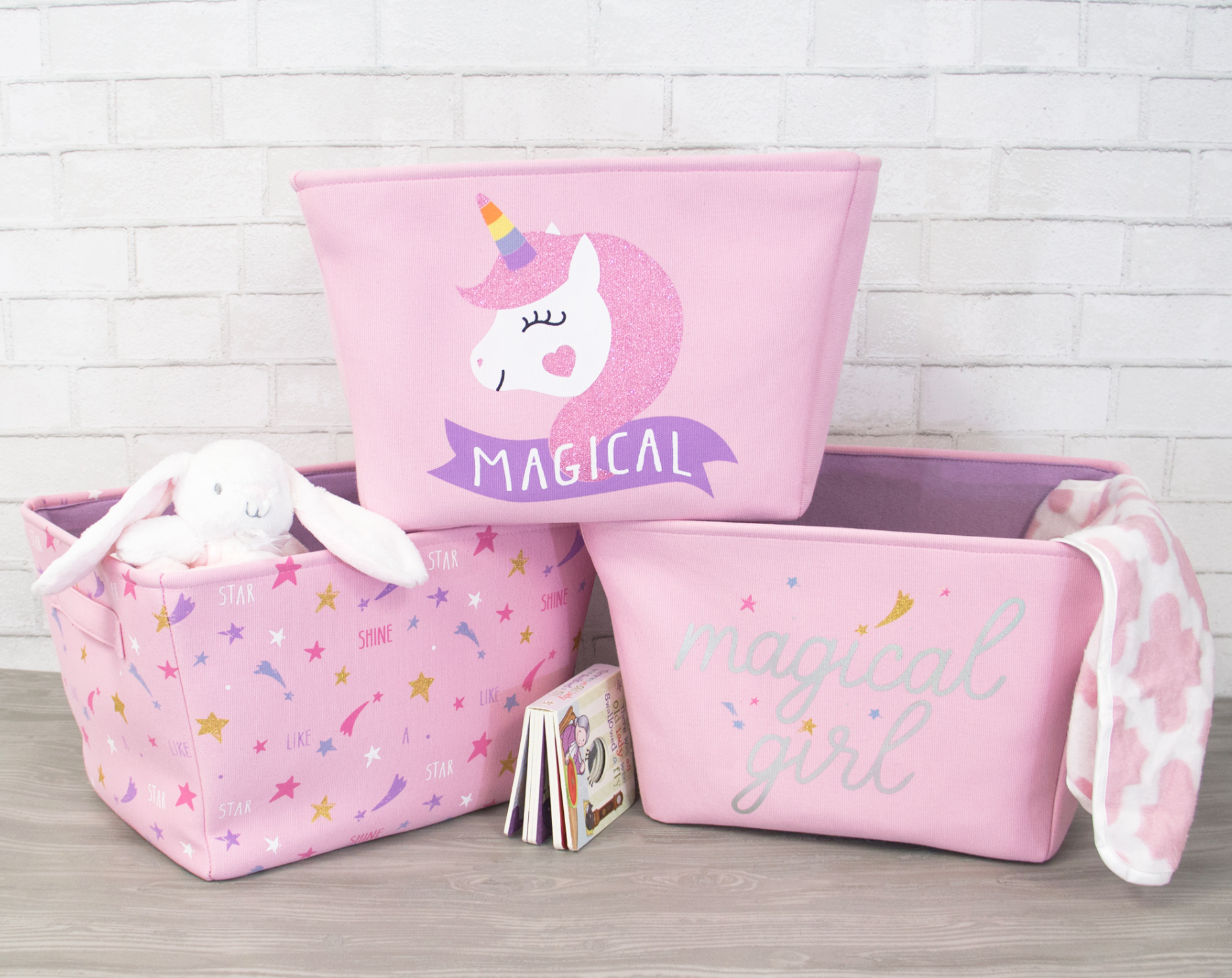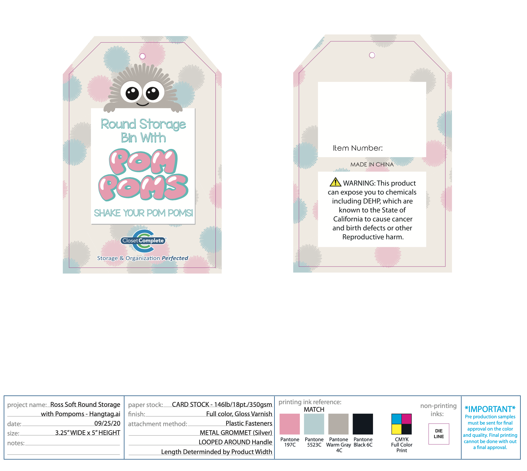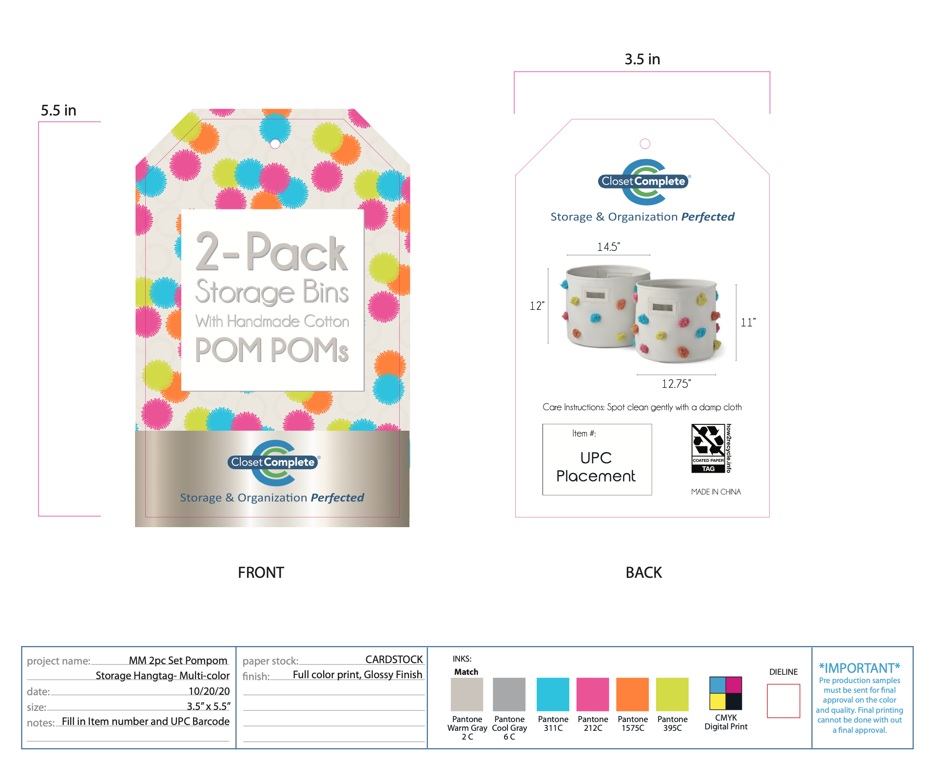 2 pack of decorative bins with pom pom. Hangtag and large dump bin design for pallet display.