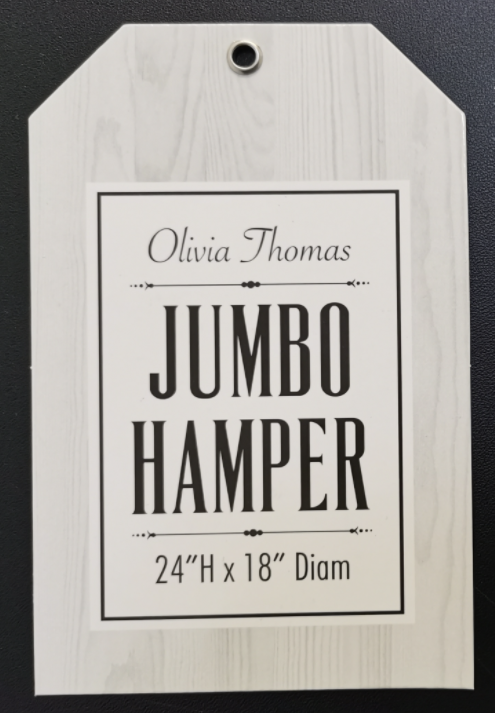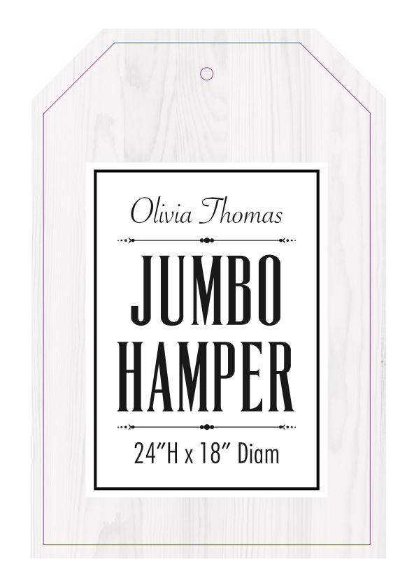 Hangtag packaging was used for these hampers . I chose a neutral light gray color with wood grain for the background, this would compliment any color hamper.