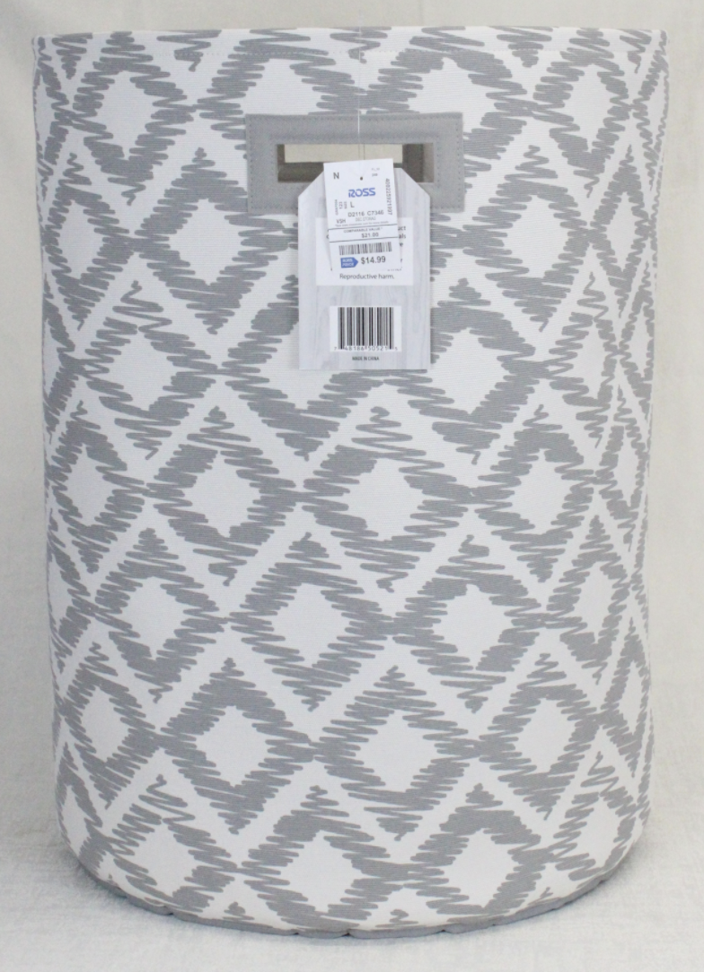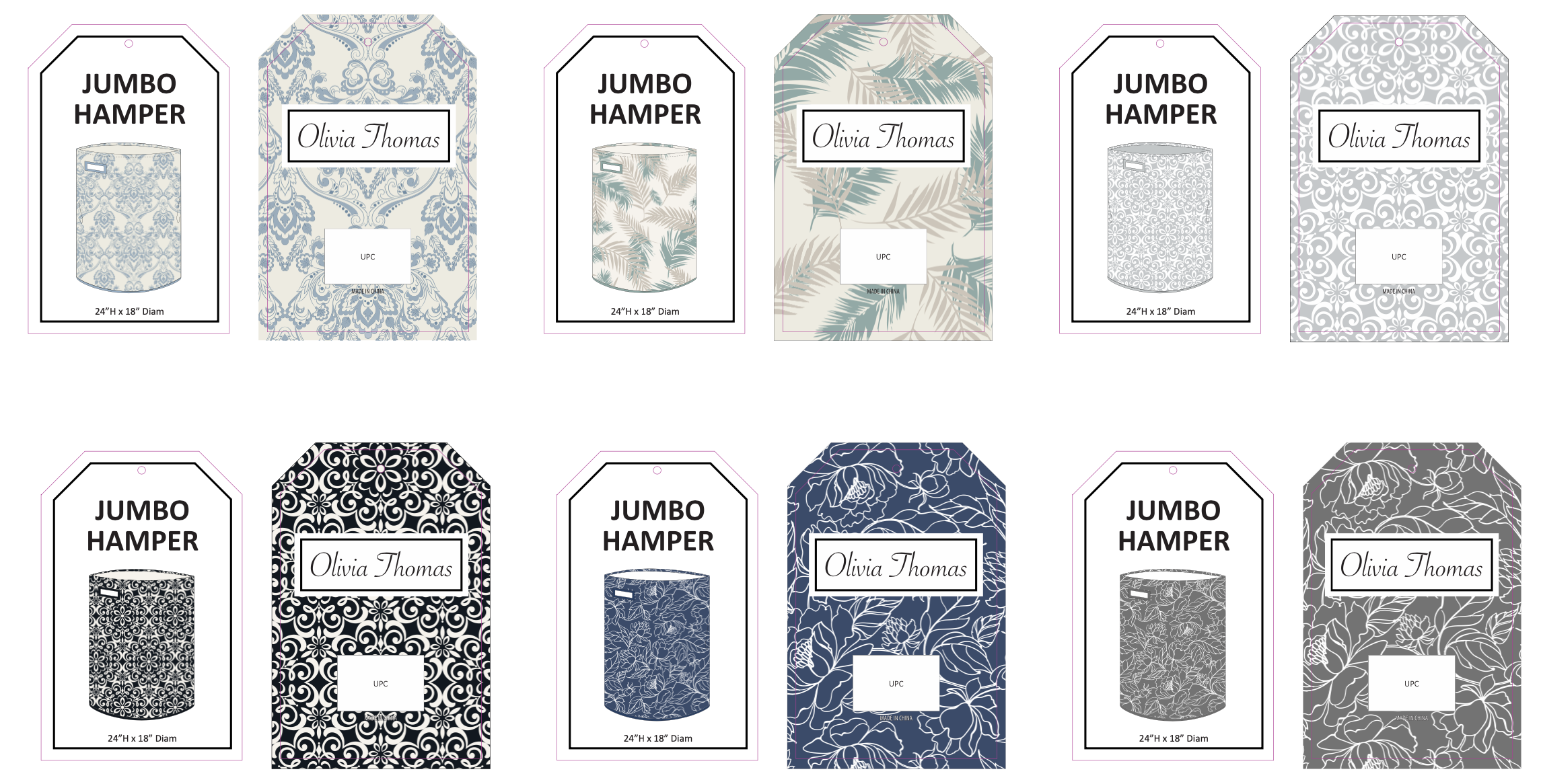Previous orders of production used a new collection of patterns. A problem we came across was that we originally designed each hangtag to matched the pattern on the hamper. We found that the printer couldn’t always match the colors to the fabric pattern colors. This also was an additional cost to use so many different spot colors. This is why we switched to the gray wood grain hangtag above. It could be printed in CMYK and used for all hamper patterns. This was a cost effective solution.