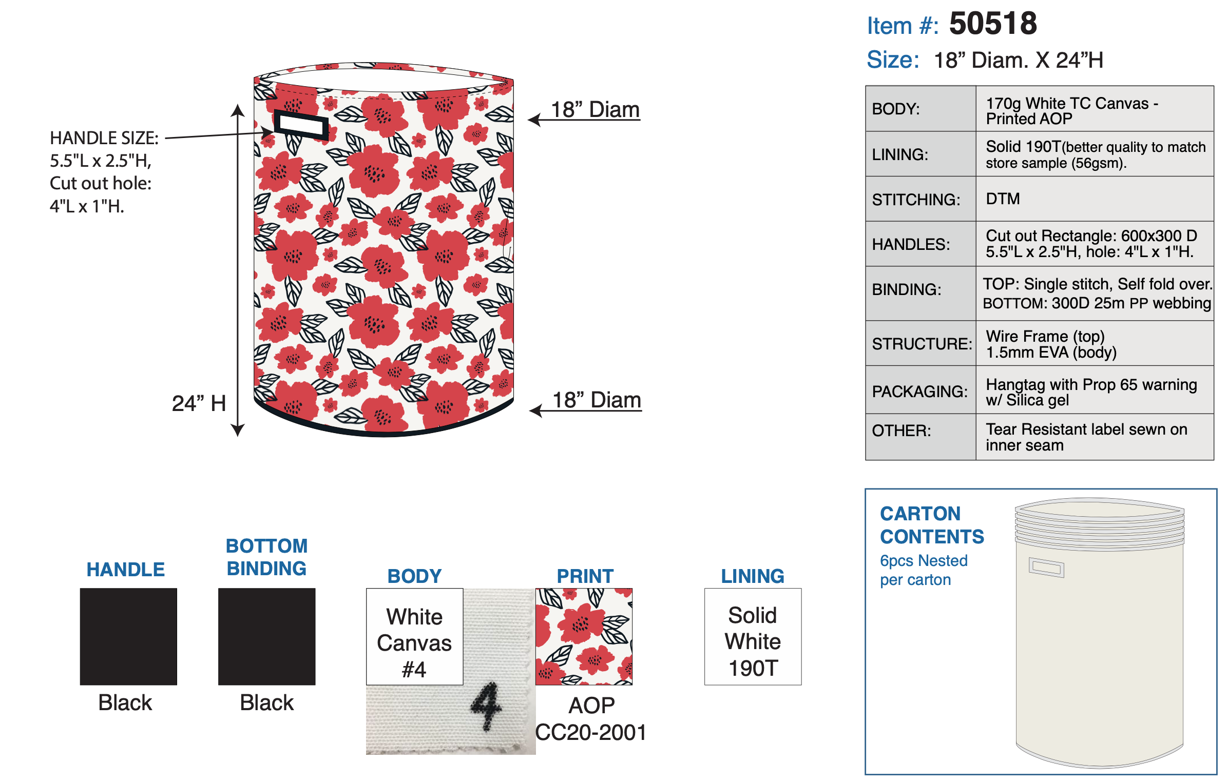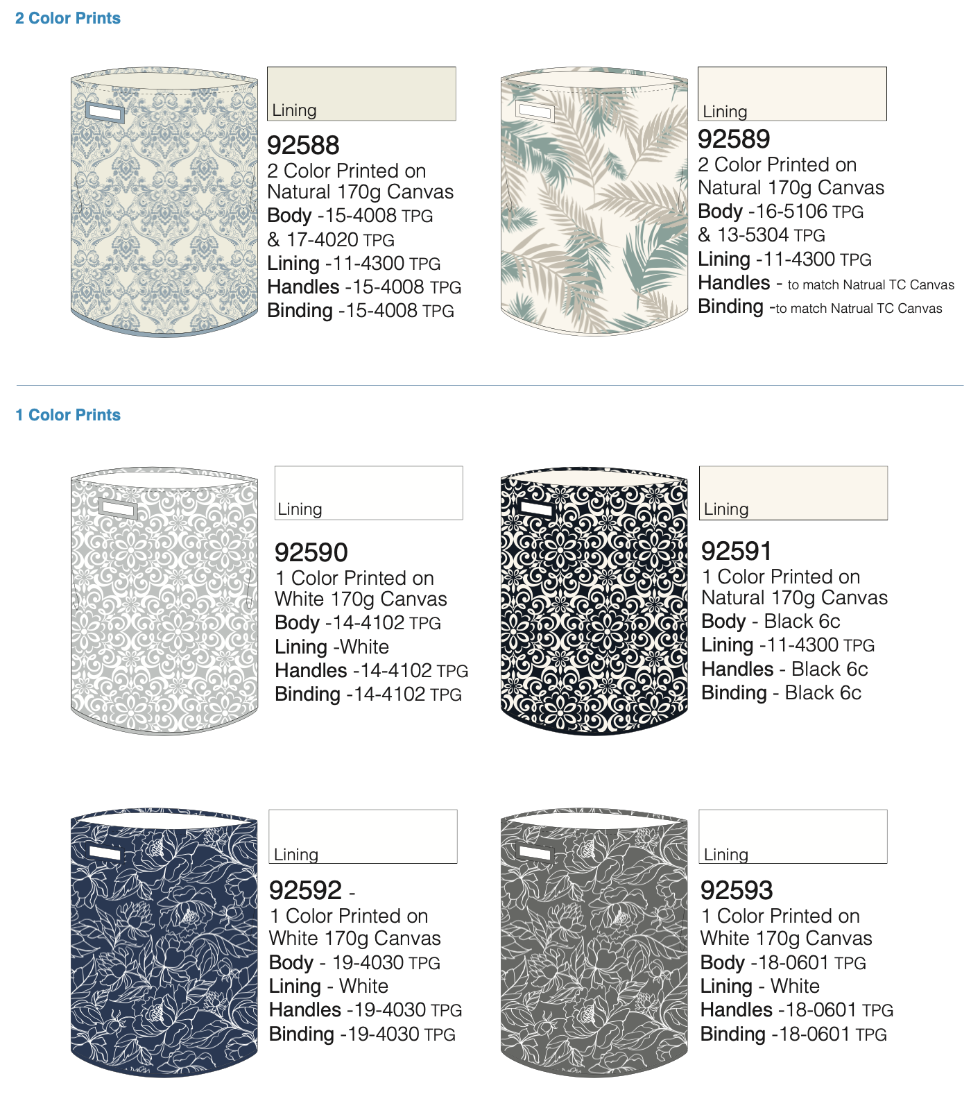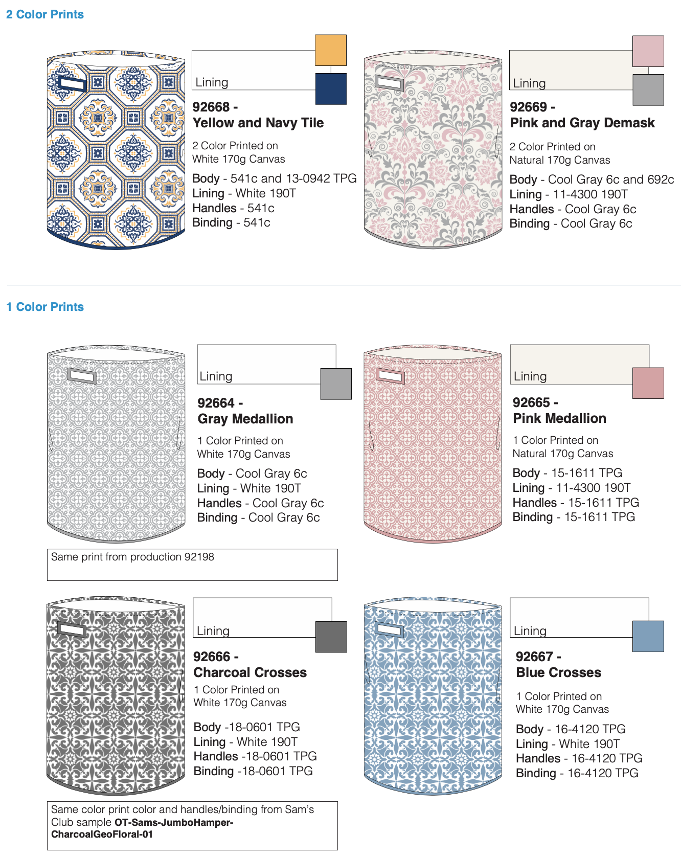 Vector patterns are chosen based on trends from buyers. I created CADs to visually show how the patterns will potentially look on the hamper. Pantone colors are chosen to go on white or natural colored canvas. Handle and binding colors are chosen to compliment the pattern.